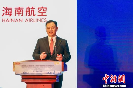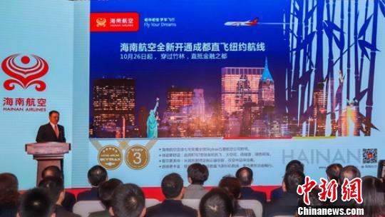 中新网成都10月26日电 (刘忠俊 骆玉龙)26日下午,海南航空举行成都往返纽约直飞航线首航仪式,当晚22时HU7915航班将从成都双流国际机场飞往纽约肯尼迪国际机场。