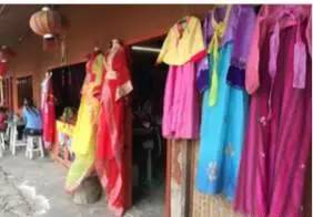 村口旅游景点的租赁服装店之一。这里租赁的服装都是汉服,店主表示,泰国人对中国文化有一种“迷之向往”,正红色的那套服装最受欢迎