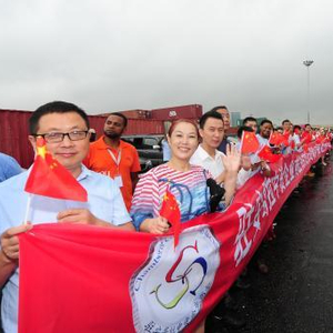 10月26日,安哥拉罗安达港码头,前来送行的中资企业员工挥动中国国旗,送别中国海军和平方舟医院船。江山 摄