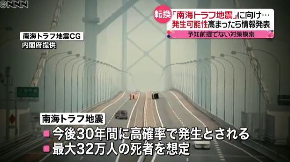 据日本电视新闻网(NNN)报道,未来30年内,日本发生“南海海沟地震”的概率很大。地震发生时,日本太平洋一侧的大部分区域将会遭受巨型海啸的袭击,死亡人数最多达32万人。发生以下3种情形时,日本气象厅将发布消息:在日本南海海沟沿线东侧将会发生8级巨大地震,西侧也有发生连续地震的可能性;南海海沟沿线发生7级前震,有可能发生8级主震;观测到海侧和陆侧板块交界处发生剧烈俯冲等异常现象。