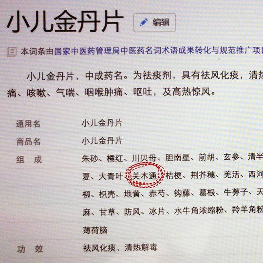 据公开资料,小儿金丹片主治祛风化痰,清热解毒,其成分表中,“关木通”这个早被取消的成分赫然在列,企业名称天津中新药业集团股份有限公司隆顺榕制药厂,执行标准《中华人民共和国药典》2010年版一部。