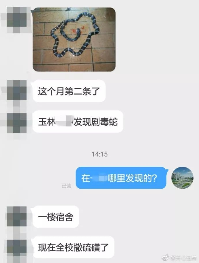 学校发现后及时在宿舍周围撒了硫磺。从照片中可看到,此蛇约长2-3米,全身呈黑色,且带有白环,小七看得都要起毛闷,估计发现蛇的这些学生也被吓得不轻!