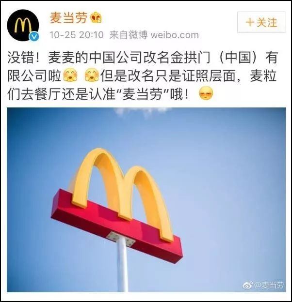 记者从麦当劳中国公关相关负责人处获悉,因业务发展需要,自2017年10月12日起,麦当劳中国总部的企业名称变更为“金拱门(中国)有限公司”,但品牌名依旧是麦当劳。