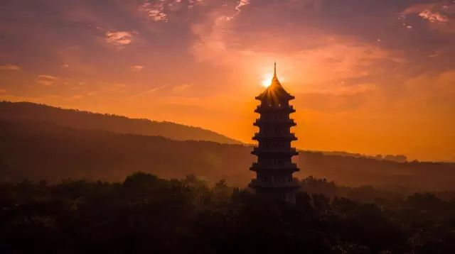 ▲落日黄昏染红了天际 衬托着灵谷寺