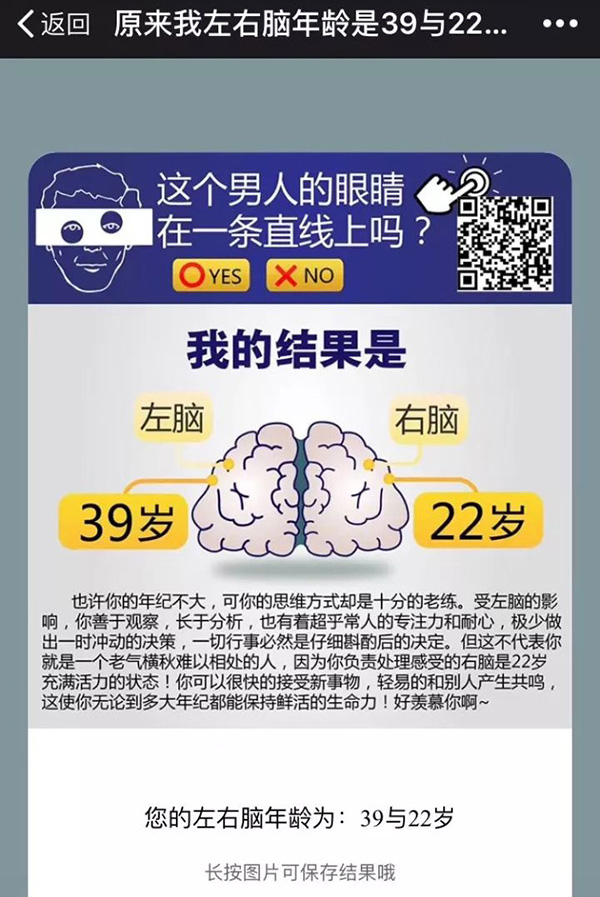 “天啊,我的左脑年龄好大!”,廖小凡(化名)说,做完朋友圈里“看看你的左右脑年龄”测试之后,她得到了“左右脑年龄:39岁和22岁”的回复。