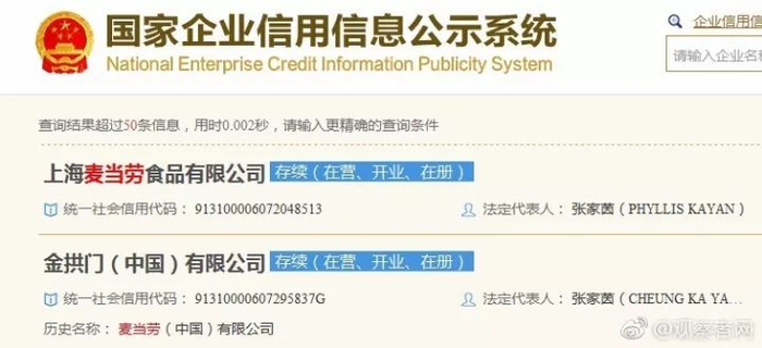 据国家企业信用信息公示系统消息,麦当劳(中国)有限公司已正式更名为金拱门(中国)有限公司。