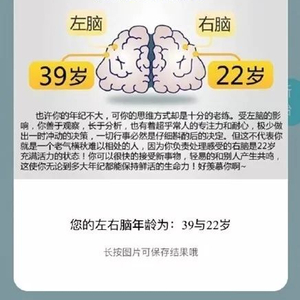近日,关于左右脑年龄测试结果的图在朋友圈引发热传。测试中,只要通过扫描测试结果图中的二维码并回答几个设定的问题后,便会生成一张显示有左右脑两个年龄测试结果的图片,图片的下方还配有相关的文字解释。
