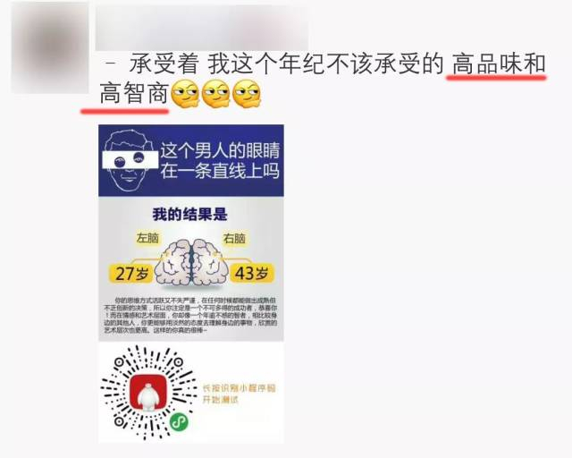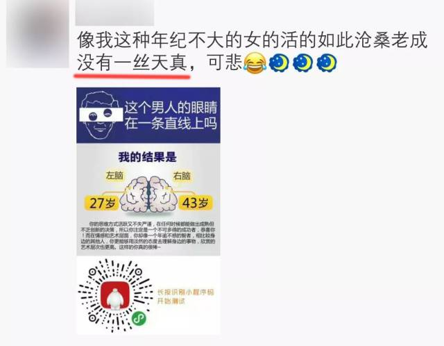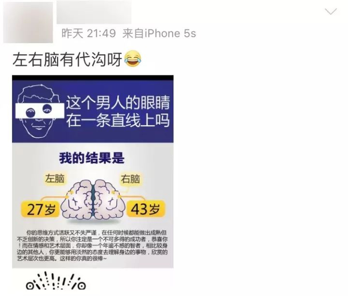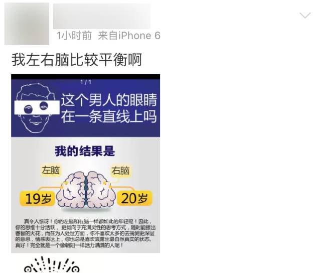 这款名为“这个男人的眼睛在一条直线上吗?”的测试,做几道题,就能分析出你左右脑的理论年龄,还给你一段分析,然后生成图片,分享到朋友圈里。
