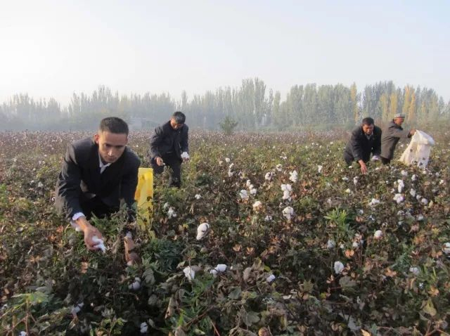 新疆阿克苏阿瓦提县恰其村,棉农玉素甫·奥斯曼(左一)与村民们一起采收棉花。