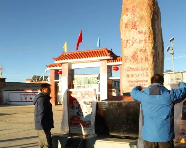 10月18日,在刻有普玛江塘海拔高度的石碑前,牧民群众集体收看十九大开幕直播,人们献上哈达。