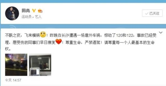 田亮在微博中写到:“不眠之夜,飞来横祸!昨晚在长沙遭遇一场意外车祸,惊动了120和122,事故已经受理,愿受伤的同事们早日康复。尊重生命,严禁酒驾!请尊重每一个人最基本的生命权。”