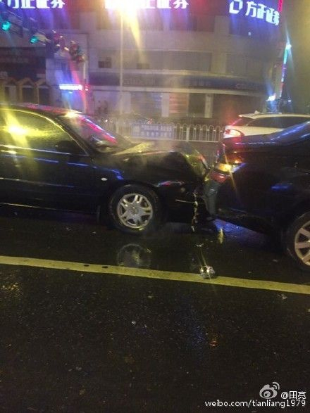 田亮上两张图片,一张是车祸现场图。两辆轿车发生严重追尾,后车前部严重变形,车灯已散落在地。从田亮和他的经纪人文敬郝的描述看,田亮本人应该没有受伤,车祸中受伤的是他的两位同事。