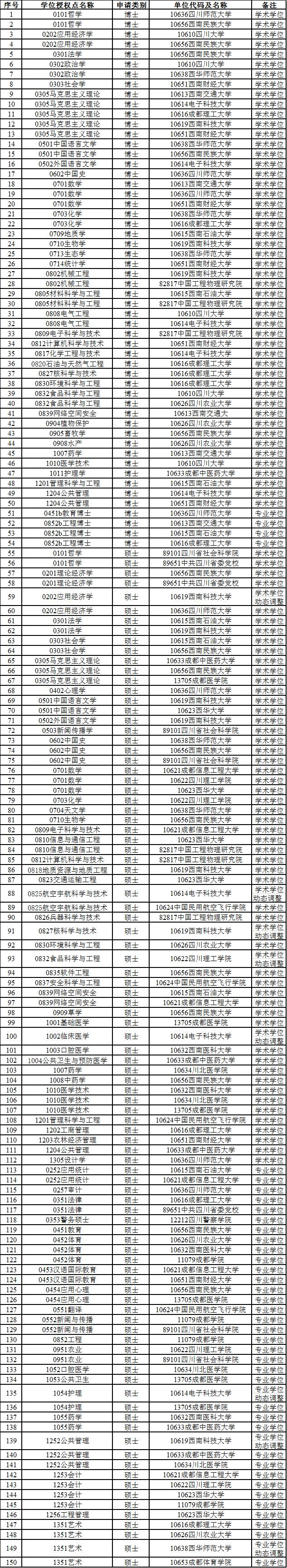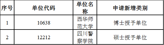 西华师范大学获得四川省新增博士授予单位推荐,四川警察学院获得四川省新增硕士授予单位推荐,四川大学获得四川省学位授权自主审核单位推荐。