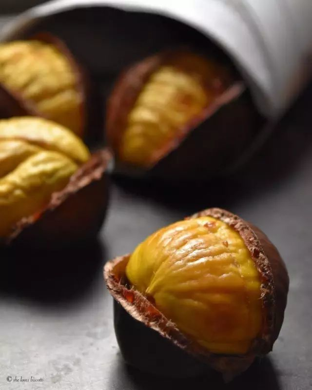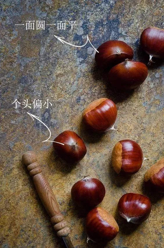 还有一个小窍门就是,要留意栗子的形状,一面圆一面平的栗子,比两面都平的栗子更甜。小点儿的栗子也通常比大栗子更好吃。