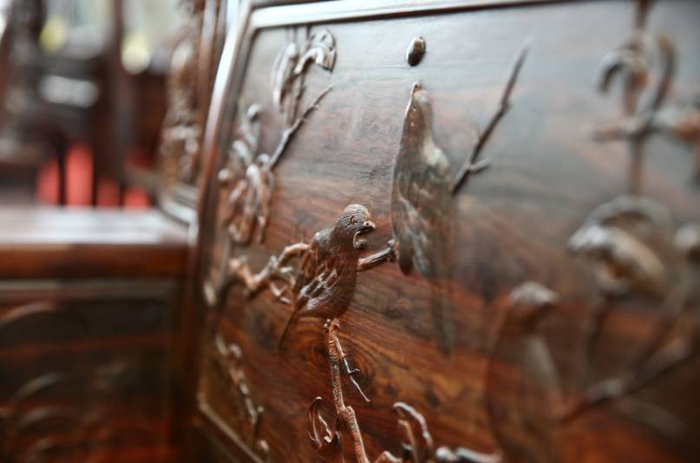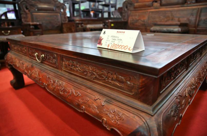 据介绍,大红酸枝又叫交趾黄檀,一般要生长500年以上才能使用,给人以古色古香的感觉。这套13件的沙发光雕刻就需要数月的时间,费工费力。