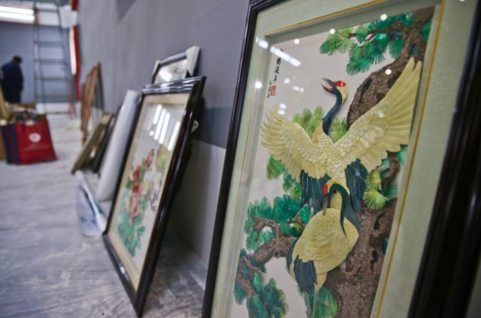 在布展现场,记者碰巧遇到了合肥非物质文化遗产马氏麦秆画的传承人马龙麟老师。她拿出一把麦秆告诉记者,麦秆画的制作过程非常繁复,从田里收集来的麦秆要经过熏、蒸、漂、刮、推、烫,以及剪、刻、编、绘等多道工序,根据画面需要进行剪裁和粘贴成画。制作的时候要依麦秆本身的光泽、纹彩和质感,来创作出既古朴自然又高贵典雅的人物、花鸟、动物图案。