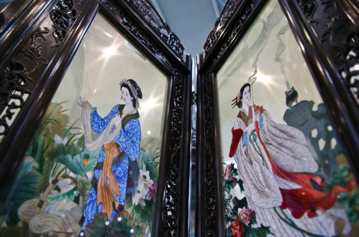 苏州范玉霞刺绣艺术馆负责人告诉记者,苏州刺绣里,最难的就是人物,用比头发丝还细的线来“刻画”人物,非常费时,“四大美女”的屏风就需要一个熟练的绣娘至少2年的时间。