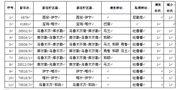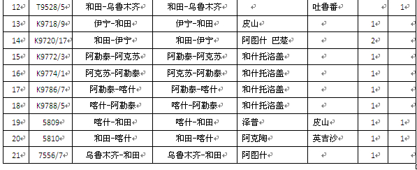 伊宁至喀什T9516/7 T9518/5次、乌鲁木齐至和田T9526/7 T9528/5次列车调整运行径路。
