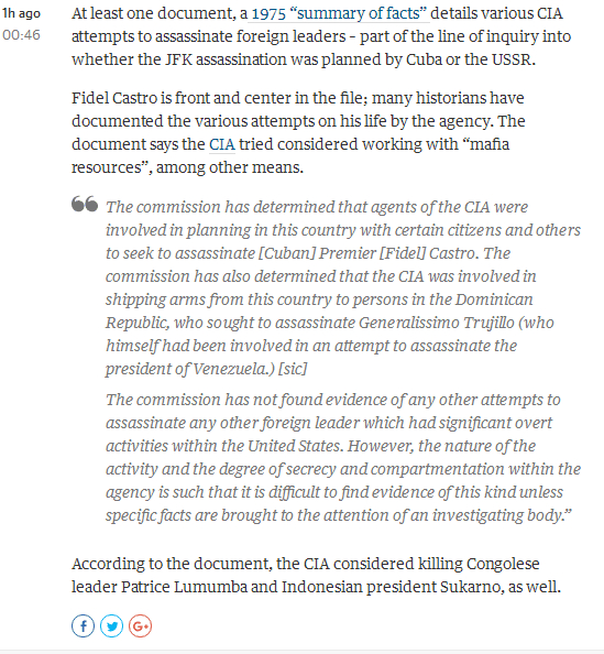 文档记录的暗杀计划还针对刚果首任总理帕特莱斯·卢蒙巴和印尼前总统苏加诺。文档显示,CIA也曾参与从古巴向多米尼加共和国运送将被用于试图暗杀该国时任总统的武器。