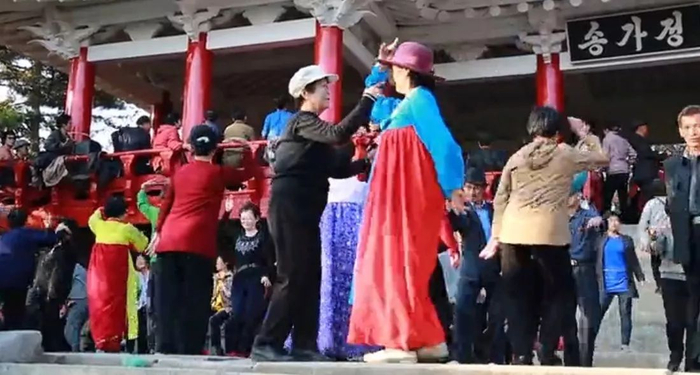 朝鲜的“广场舞”通常没有领舞,也没有统一的舞步编排,一律各人按自己的节奏和习惯即兴发挥,甚至还有民族舞与现代舞的混搭,别具风情。