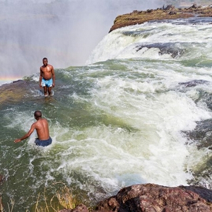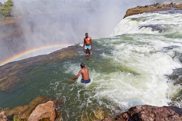 在一年的大多数时间中,赞比西河奔流的河水都会从维多利亚瀑布的顶端倾泻而下。只有当旱季来临、水流趋于平缓时,坐落在100米高瀑布顶端的“魔鬼池”才会逐渐显现。此时水位较低,天然岩石墙的高度足以形成一道屏障,以阻止游客被冲下瀑布。