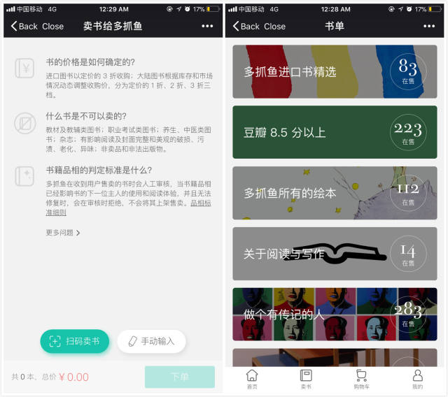 多抓鱼帮读者去掉了交易的复杂性。用户只需打开多抓鱼微信号,通过扫码,即可看到图书收购价,然后填好地址下单,快递人员上门取书。与传统涉足二手书交易的互联网产品不同,多抓鱼提供统一的审核、定价、消毒和再包装服务。