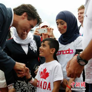 资料图:加拿大总理特鲁多与叙利亚移民。