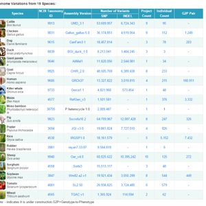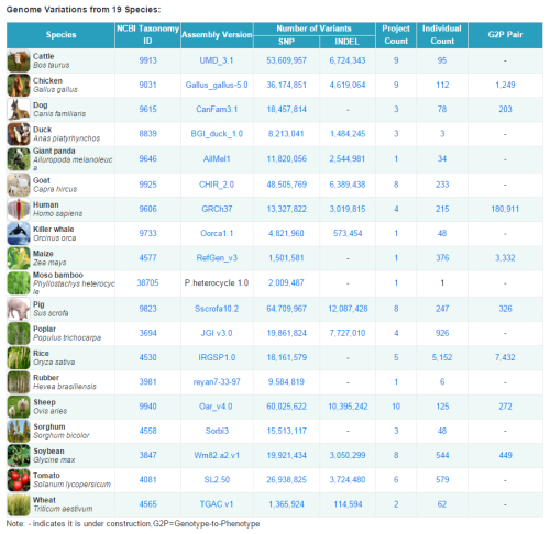基因组序列变异是基因组DNA水平发生的可遗传变异,是生物多样性的基础,是物种进化、分子育种、优良性状选育、人类疾病等研究最为宝贵的遗传资源。近年来,随着测序技术发展,越来越多物种的基因组被精细解析;物种内遗传多态变异位点也通过大规模的群体测序获得,并广泛应用于复杂性状的关联解析。国际两大数据中心NCBI和EBI旗下的dbSNP和EVA是主要的基因组序列变异资源库。今年5月,NCBI宣布自2017年9月1日起,dbSNP和dbVar两大数据库停止接收非人物种的SNP提交信息,自2017年11月1日起停止非人物种的SNP在线查询与提交。这对基于序列变异研究的科研人员造成了不便。