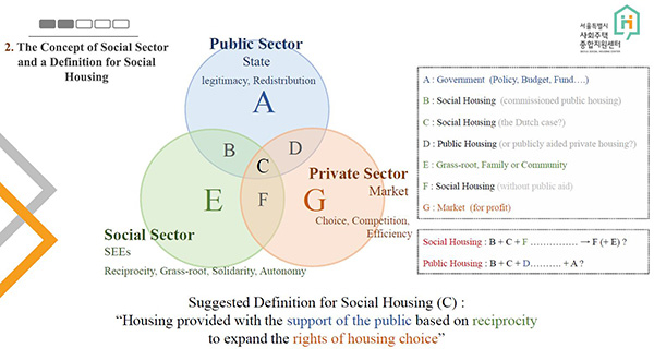 KyungHo CHOE用了一张表格解释韩国的社会住房的含义,图表中三个大的圆圈分别代表政府(公共部门代表着合法性和再分配)、市场(私人部门代表着选择、竞争和高效)和社会经济组织(社会部门代表着互惠、草根、团结和自治。社会经济组织,英文为social economy entity,简称SEE)。