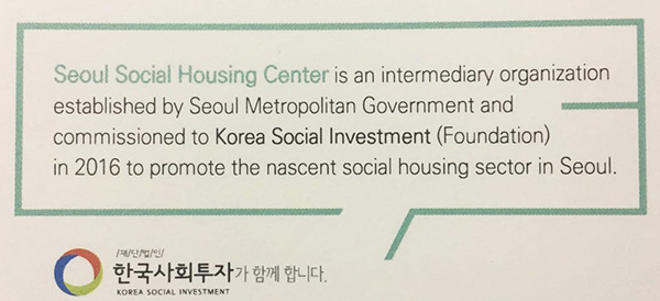 首尔社会住房中心的负责人KyungHo CHOE首先解答了我的疑惑,他说,首尔社会住房中心算是一个协调性的组织,成立于2016年6月,是一个为期两年的试验性项目。虽然在行政级别上,首尔社会住房中心隶属于首尔住房与城市建设部的住房政策部门下。但是,首尔社会住房中心与韩国社会投资(Korea social investment)部门共用一个办公室。这个社会投资部门主要的业务是“集约型投资”(impact investment),是韩国近年来推动的社会经济(social ecomony)发展领域的重要部门,而社会住房又是社会经济非常重要的一个部分。