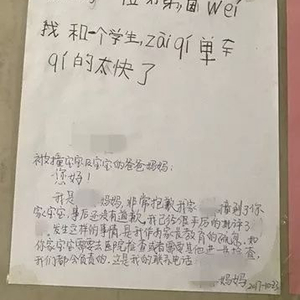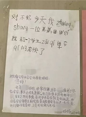 " 对不 qi,今天我 zhuang shang 一位弟弟,因 wei 我和一个学生 zai qi 单车,qi 太快了。" 做了这一决定后,在妈妈的指导下,小睿从晚上 9 点开始写道歉信,一直写到 11 点多,一共手写了 6 份。因为刚上小学,有些字小睿还不会写,但刘女士并没有代笔而是让他用拼音代替,可谓是道歉诚意满满。在小睿的道歉信后,刘女士也进行补充,文中她一再表示抱歉,表示发生这样的事是自己教育的疏忽,提出如果被撞的宝宝需要去医院检查和治疗都会负责,并留下自己的联系方式。