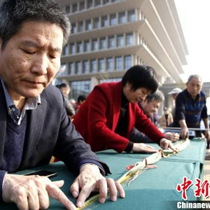 葱农们正在整理参加评选的大葱。 沙见龙 摄