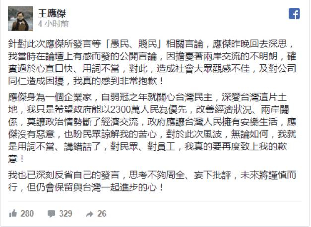 27日,王应杰在脸书上对自己的讲话做出道歉: