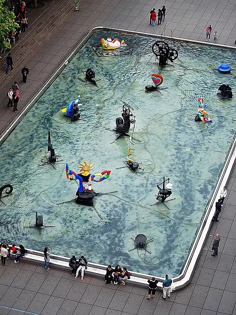 在蓬皮杜艺术中心的喷泉中,有一组别致的雕像↓↓这组雕像是受到法国前总统密特朗邀请,由妮基和她的第二任丈夫让·丁格利一起设计的。