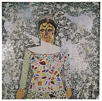 妮基创作了一幅名叫“一个女人”的自画像作品↓↓这幅画由陶瓷碎片、玻璃碎片、咖啡豆拼贴而成,仿佛象征着她支离破碎的生活与内心。
