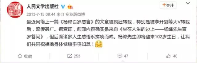 然而真相却是:这篇文章确实引用了杨绛先生的部分文字,但也有很多内容是网友假先生之名杜撰的。