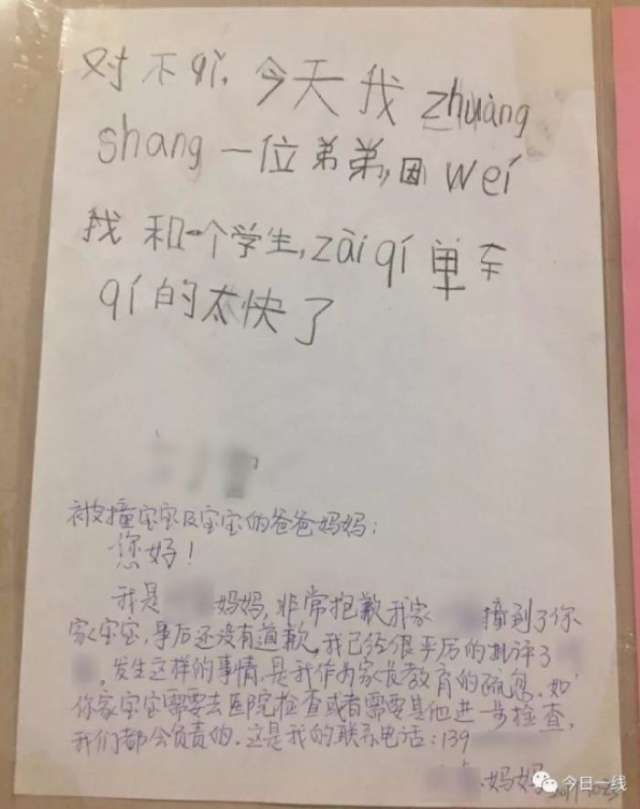 了解情况后,刘女士第一反应是:" 赶紧看看被撞的孩子有没有事!" 但由于当时双方都没有留下电话,于是刘女士在严厉批评了儿子之后,便让他手写了六份道歉书在全小区张贴寻人。因为小睿刚上小学,有些字还不会写,于是就用拼音代替。