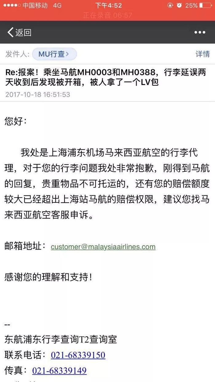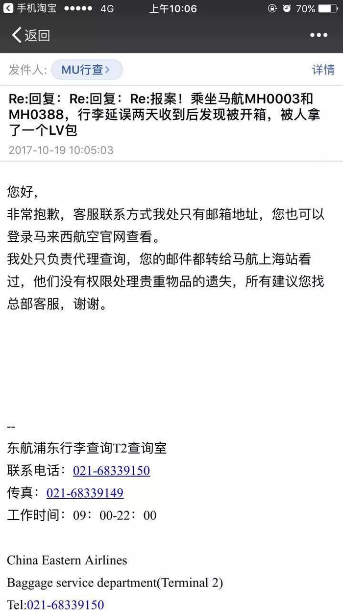 10月18日16:51,署名是“东航浦东行李查询T2查询室”的机构给李小姐发来了第一个回复邮件,写道:“我处是上海浦东机场马来西亚航空的行李代理,对于您的行李问题我处非常抱歉,刚得到马航的回复,贵重物品不可托运的,还有您的赔偿额度较大,已经超出上海站马航的赔偿权限,建议您找马来西亚航空客服申诉。”