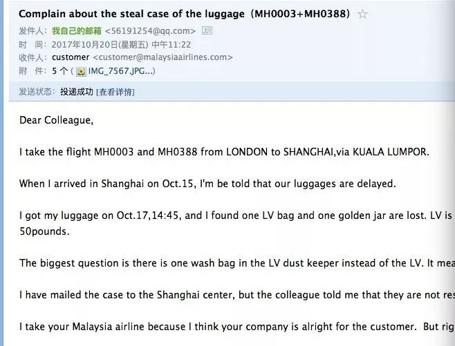 10月20日中午11:22,李小姐发了一封英文邮件给马航的投诉邮箱,直到24日下午5点,她终于收到了回复信息,然而对方只是希望她提供更多相关细节信息,以便做进一步查询,截至发稿前,李小姐仍未得到任何建设性赔偿信息。