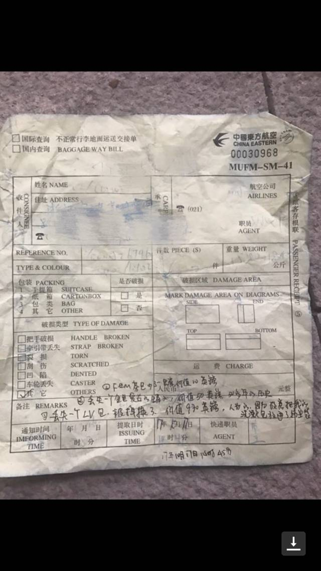 李小姐傻眼了,她赶紧在快递员提供的不正常行李地面运送交接单上,写下了自己丢东西的详情,以及LV包的价值。