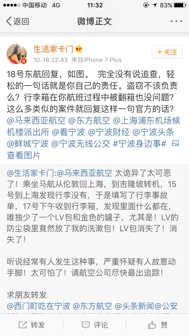 气愤不已的李小姐马上拨打110报了警,不过宁波警方获悉此事后,建议李小姐向上海浦东警方报案,同时,李小姐没敢耽误,马上联系了马航在中国的行李代理方——东航。