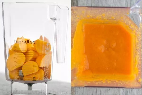 步骤一 :从柿子顶部切开,用小勺子取出果肉打成果泥,剩下部分作为容器备用;