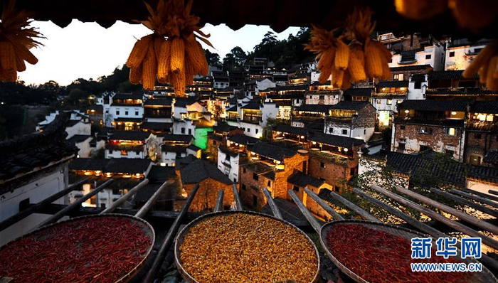 这是黄昏中的篁岭古村(10月25日摄)。近日天气晴朗,江西省婺源县江湾镇篁岭村村民抓住时机采摘、晾晒皇菊及蔬果。明黄的菊花、火红的辣椒……各种颜色将篁岭古村装扮成巨大的“调色板”,引来众多游客感受乡村美景。新华社记者 宋振平 摄