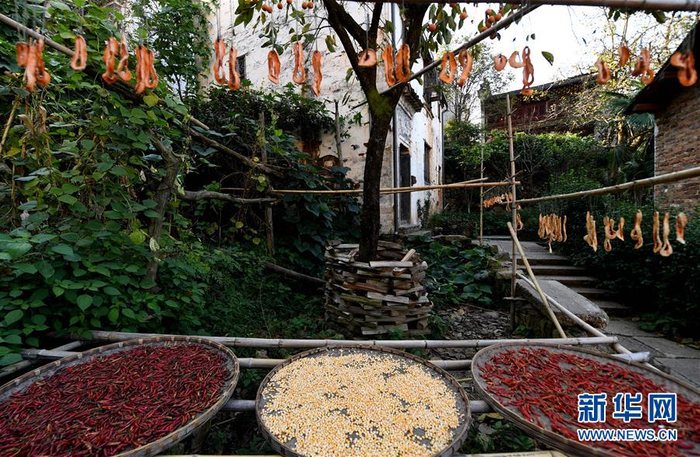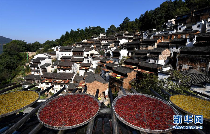10月26日拍摄的篁岭古村一角。近日天气晴朗,江西省婺源县江湾镇篁岭村村民抓住时机采摘、晾晒皇菊及蔬果。明黄的菊花、火红的辣椒……各种颜色将篁岭古村装扮成巨大的“调色板”,引来众多游客感受乡村美景。新华社记者 宋振平 摄