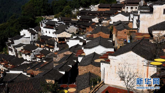10月26日拍摄的篁岭古村。家家户户晾晒各种蔬果及皇菊。近日天气晴朗,江西省婺源县江湾镇篁岭村村民抓住时机采摘、晾晒皇菊及蔬果。明黄的菊花、火红的辣椒……各种颜色将篁岭古村装扮成巨大的“调色板”,引来众多游客感受乡村美景。新华社记者 宋振平 摄