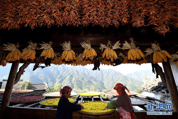 10月26日,篁岭村村民在晾晒皇菊。近日天气晴朗,江西省婺源县江湾镇篁岭村村民抓住时机采摘、晾晒皇菊及蔬果。明黄的菊花、火红的辣椒……各种颜色将篁岭古村装扮成巨大的“调色板”,引来众多游客感受乡村美景。新华社记者 宋振平 摄
