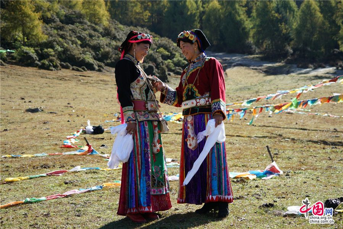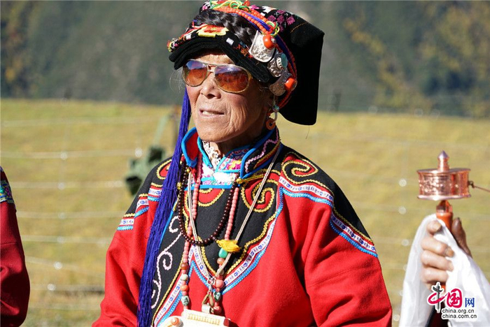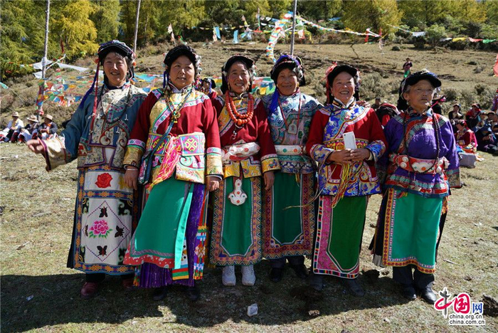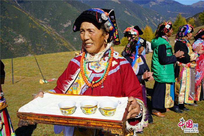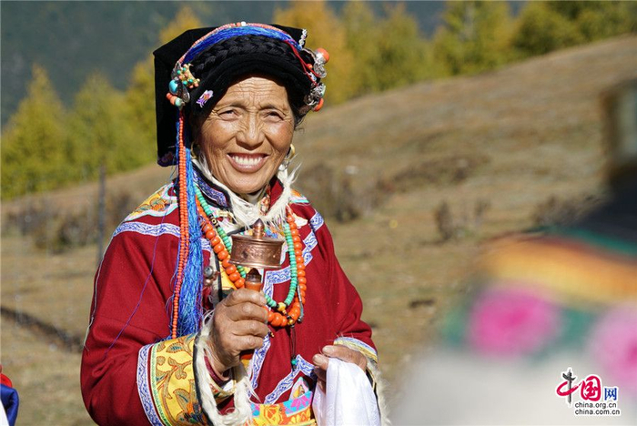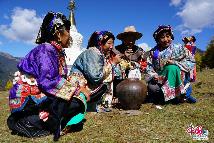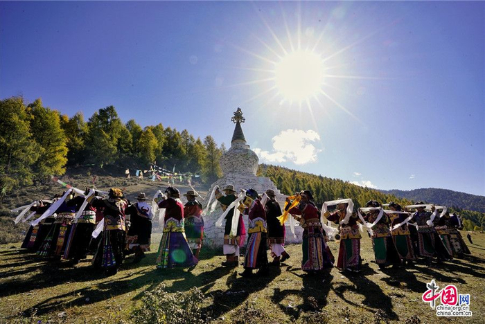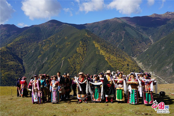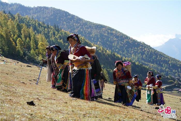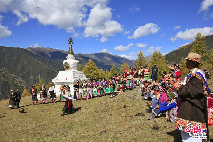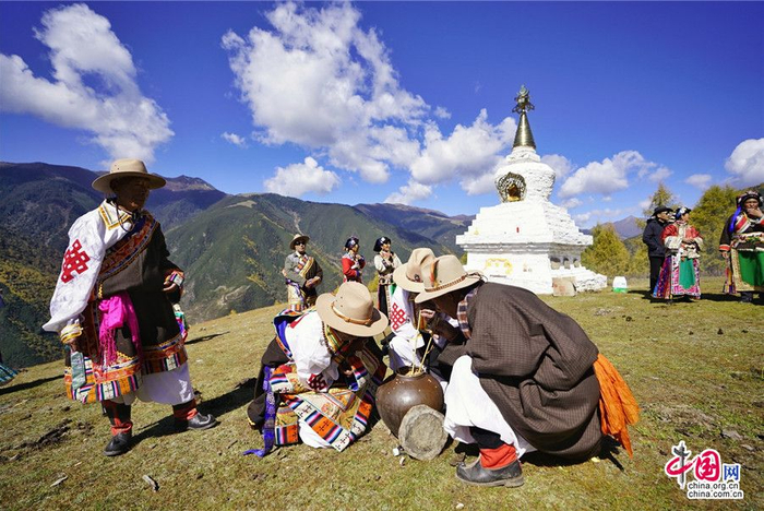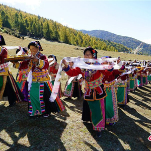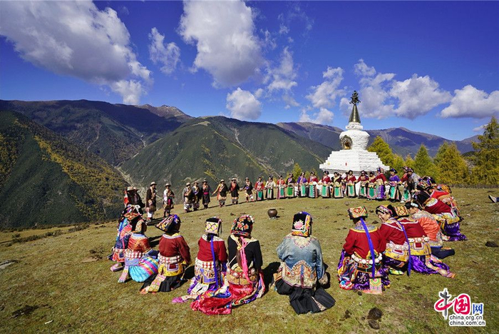 在四川阿坝州小金县结斯乡王家寨村,村里的老人们身着民族盛装登高远眺、煨桑祈福、多才多艺的村民们跳起锅庄唱起歌度重阳,愉快的歌声荡漾在山坡。