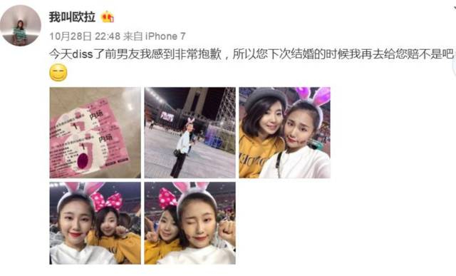 她说:今天diss了前男友我感到非常抱歉,所以您下次结婚的时候我再去给您赔不是吧。