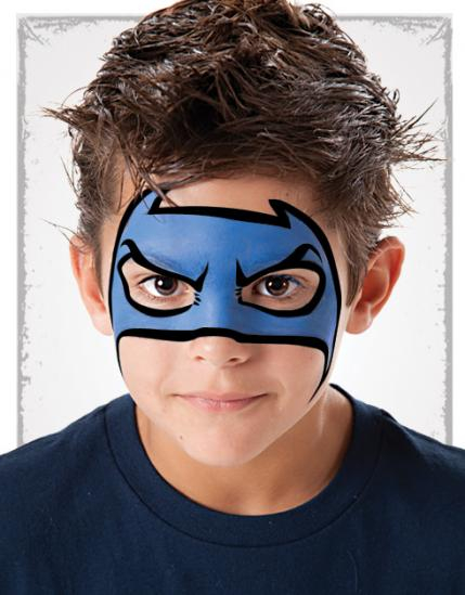 先用蓝色画笔,在脸上画出一个面具的形状,眼睛的部分可以着重画一下;然后用黑色的颜料勾勒出整个轮廓;注意“愤怒”的眉毛是要上挑的,无论眉头还是眉梢。
