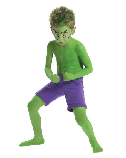这个造型需要用很多颜料:首先要用海绵在脸上和身体上涂上绿色;在颧骨上用画笔,朝着耳朵的方向画出线条,并在脸颊两侧各画一条垂直的阴影线;再沿着泪沟和法令纹画两道黑线;最后画出“愤怒的眉毛”。记得要给宝贝配一条酷炫的短裤哦。